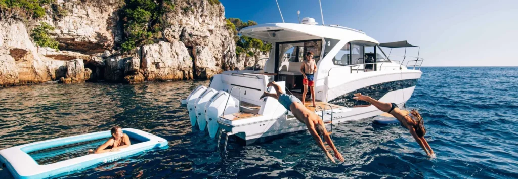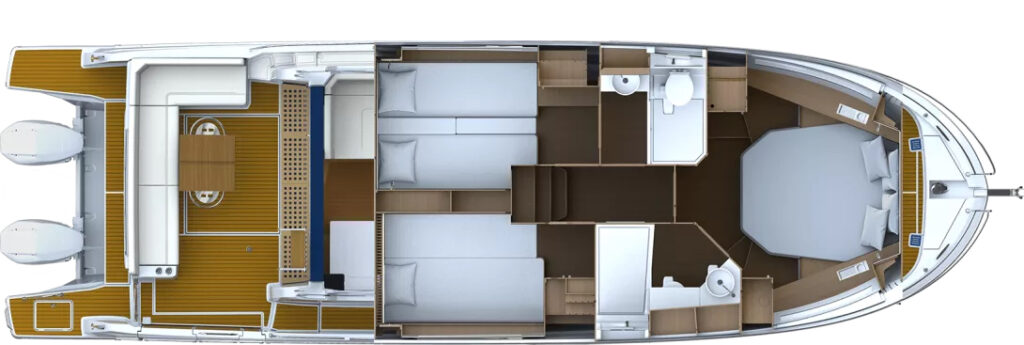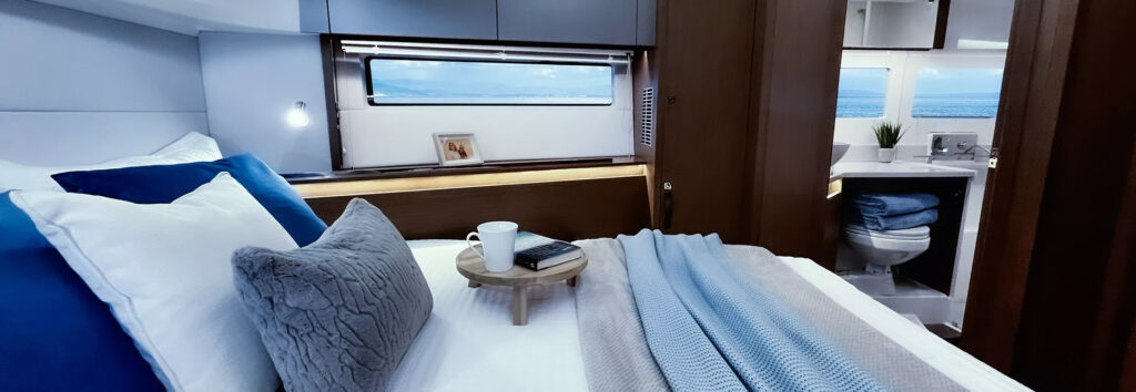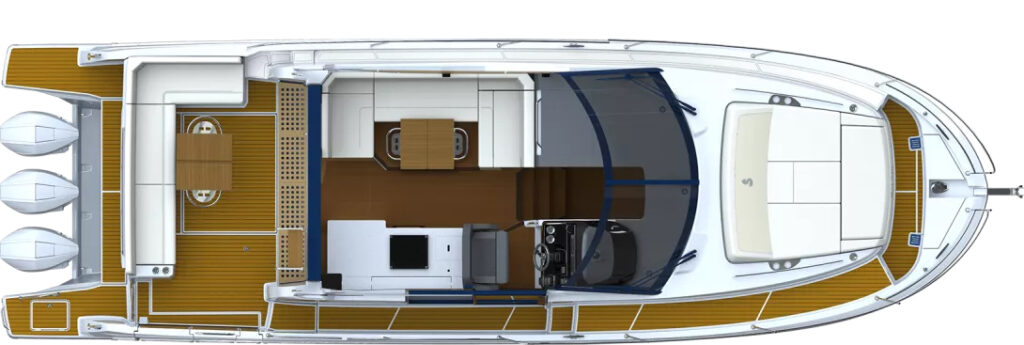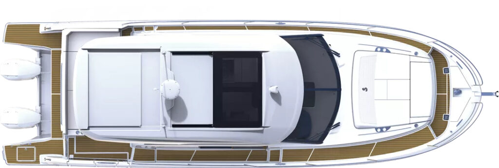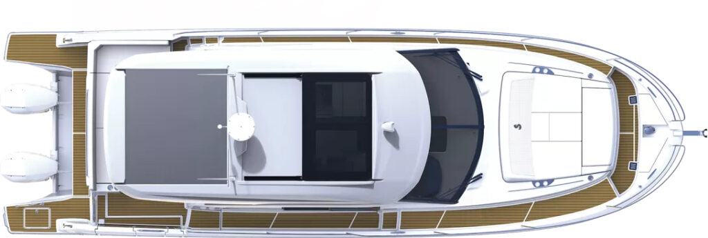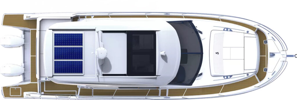 La Antares 12 Coupe está equipada de serie con un amplio techo acristalado eléctrico que inunda el espacio habitable con luz natural. En el interior, el ventanal se oculta para crear una continuidad perfecta entre la bañera y el puesto de mando, lo que garantiza un paso fluido entre los espacios.