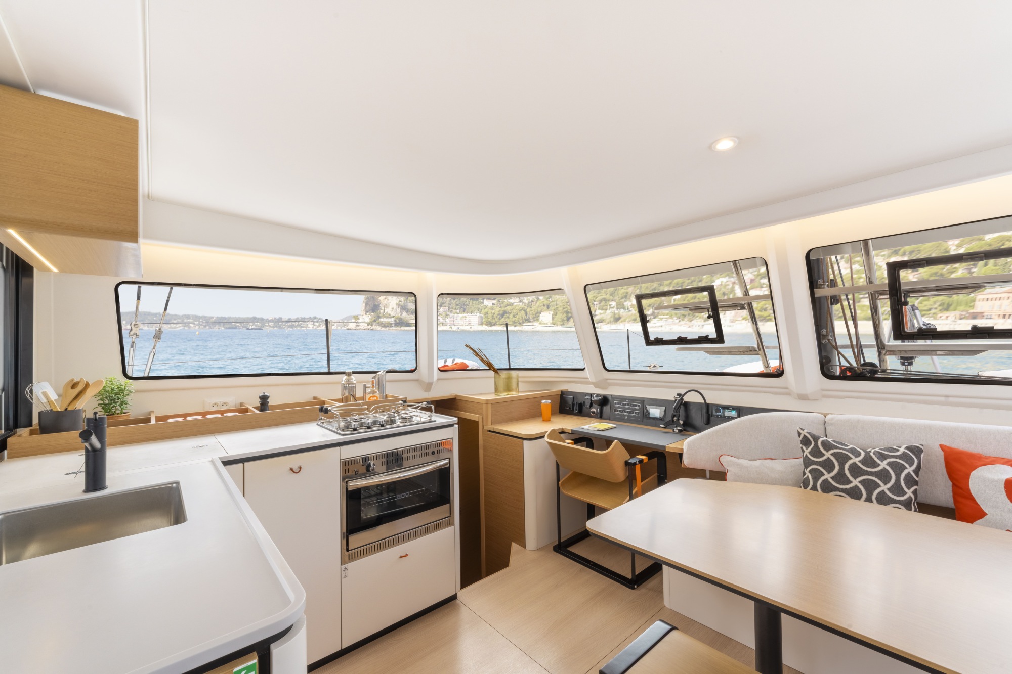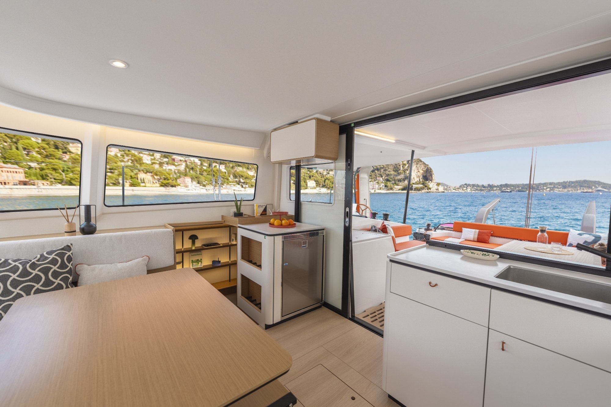 Este nuevo modelo ofrece un salón interior bañado en luz natural y una cocina totalmente equipada que se abre a la bañera, como una unión entre los espacios interiores y exteriores. El casco dedicado a los propietarios combina un amplio dormitorio con un gran cuarto de ducha en proa y, algo poco habitual en un barco de este tamaño, un vestidor. Una zona de oficina ergonómica permite combinar como nunca antes la vida profesional con la pasión por el mar. En el casco opuesto, los invitados pueden disfrutar de dos dormitorios y dos cuartos de ducha privados.